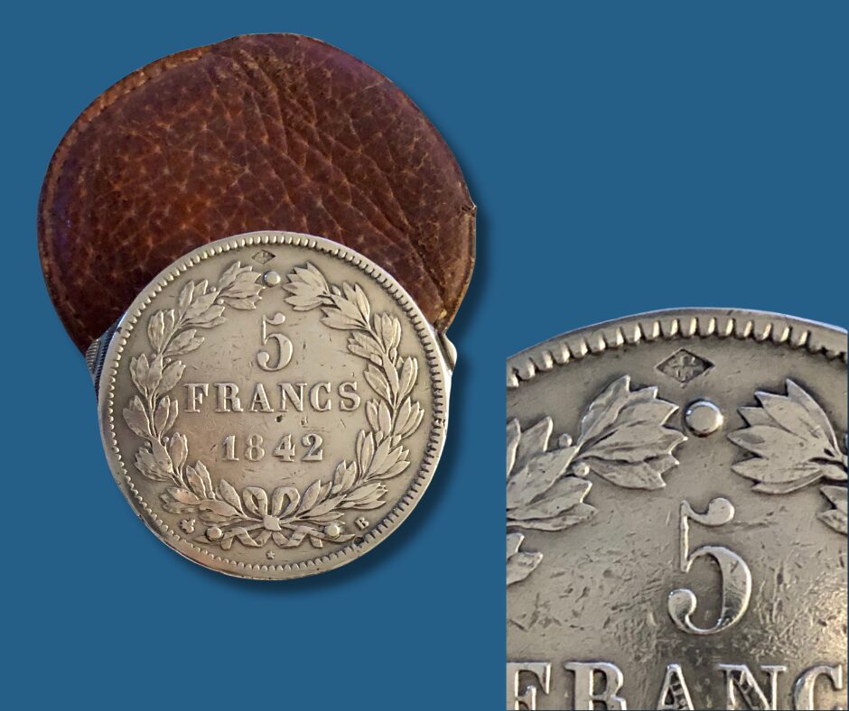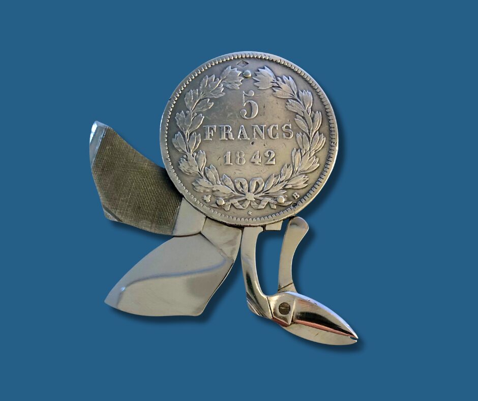 Couteau onglier monnaie en argent, pièce argent 5 Francs de 1842, Louis Philippe par Eloi Pernet, poinçons de titre  et poinçons d’orfèvre ELOI en losange sur la face de la monnaie – Diamètre 3,7 cm – longueur lame 2,5 – période 1900-1940